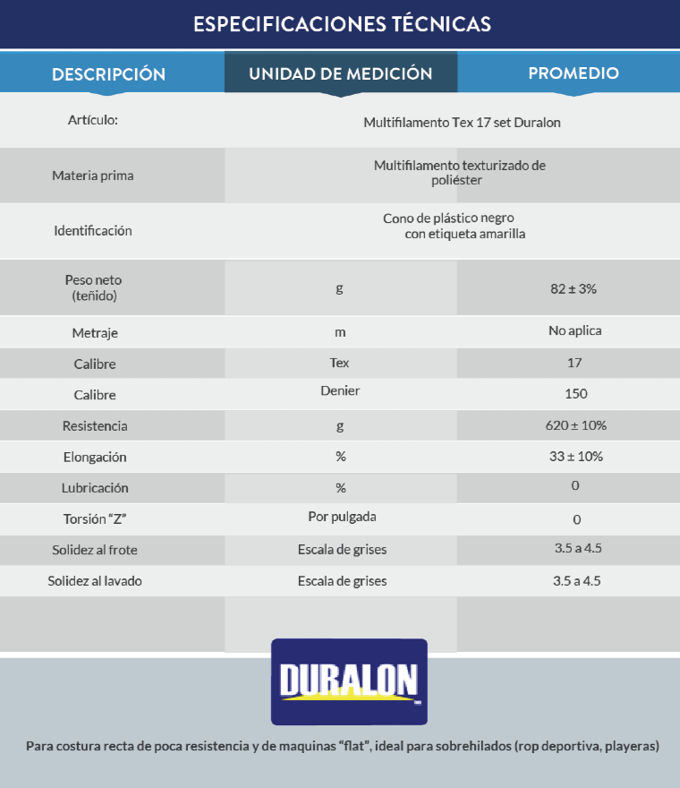 Para costura recta de poca resistencia y de máquinas "flat", máquina over. Ideal para sobre hilados (ropa deportiva, playeras). Para telares de etiqueta media definición.